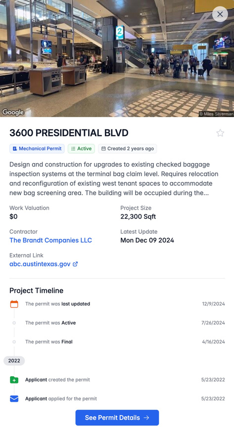 Project Timeline & Size Data: Track a project’s progress and understand its scale (sq ft and estimated value).